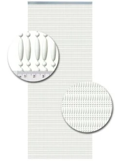 Dit zijn kwalitatief gezien echt goede vliegengordijnen. Ze zijn supersterk! De schakels zijn gemaakt van geanodiseerde draad en zijn kleur-echt. In één meter (breed) zitten 78 banen normale schakels. De groote van deze schakel is 24 mm lang en 12 mm breed. Het geheel hangt aan een zilverkleurige rail.