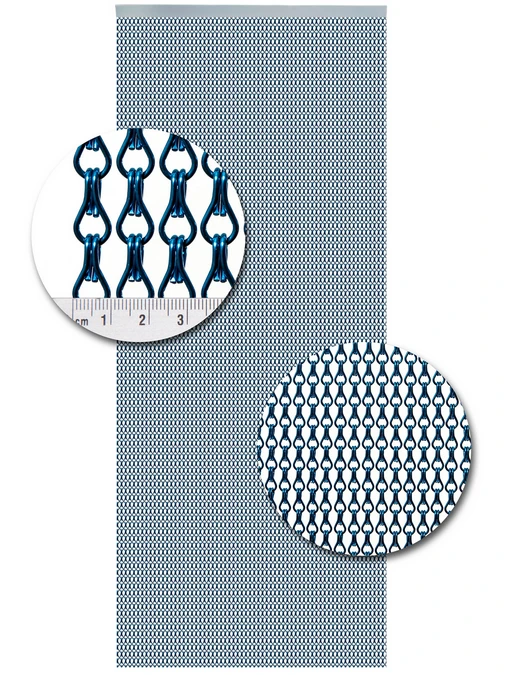 Dit zijn kwalitatief gezien echt goede vliegengordijnen. Ze zijn supersterk! De schakels zijn gemaakt van geanodiseerde draad en zijn kleur-echt. In één meter (breed) zitten 78 banen normale schakels. De groote van deze schakel is 24 mm lang en 12 mm breed. Het geheel hangt aan een zilverkleurige rail.
