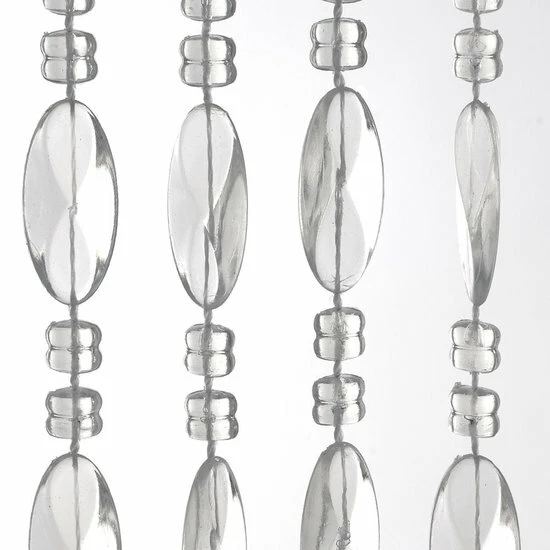 Dit kralengordijn met parelvormige hangertjes zorgt voor een vrolijke noot in huis. De kraaltjes hebben een parel-achtige vorm en zijn afgewisseld met kleine ronde hangertjes. Het kralengordijn wordt over het algemeen gekocht om deuropeningen binnenshuis te voorzien van iets decoratiefs. Uiteraard kun je dit deurgordijn ook als zijnde vliegengordijn in de opening van je buitendeur hangen, maar er zit wel wat ruimte tussen de strengen, veel vliegen zullen worden tegengehouden, maar ongetwijfeld zullen er ook wat tussendoor naar binnen vliegen als je deze hele dag je deur open hebt staan.