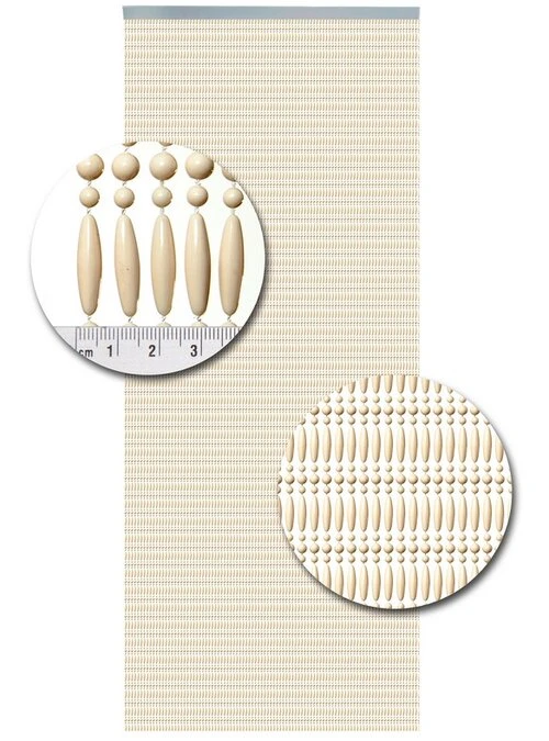 Dit zijn kwalitatief gezien echt goede kralengordijnen. De draadjes die gebruikt zijn, zijn gemaakt van nylon en dus extra sterk. De kunststof kralen zijn stuk voor stuk aan het nylon draad gesmolten. Het geheel hangt aan een witte cassette. Het is een vrij dicht kralengordijn waarbij er op circa elke centimeter een streng hangt. Om als voorbeeld even een vliegengordijn met een breedte van 90cm te noemen; hier hangen circa 90 strengen aan.