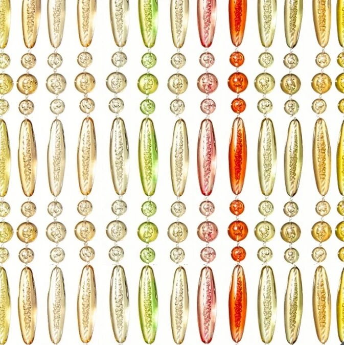 Dit zijn kwalitatief gezien echt goede kralengordijnen. De draadjes die gebruikt zijn, zijn gemaakt van nylon en dus extra sterk. De kunststof kralen zijn stuk voor stuk aan het nylon draad gesmolten. Het geheel hangt aan een witte cassette. Het is een vrij dicht kralengordijn waarbij er op circa elke centimeter een streng hangt. Om als voorbeeld even een vliegengordijn met een breedte van 90cm te noemen; hier hangen circa 90 strengen aan.