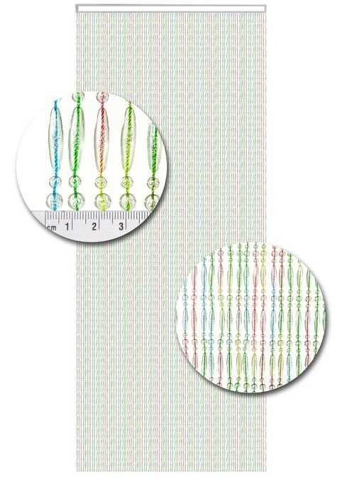 Dit zijn kwalitatief gezien echt goede kralengordijnen. De draadjes die gebruikt zijn, zijn gemaakt van nylon en dus extra sterk. De kunststof kralen zijn stuk voor stuk aan het nylon draad gesmolten. Het geheel hangt aan een witte cassette. Het is een vrij dicht kralengordijn waarbij er op circa elke centimeter een streng hangt. Om als voorbeeld even een vliegengordijn met een breedte van 90cm te noemen; hier hangen circa 90 strengen aan.