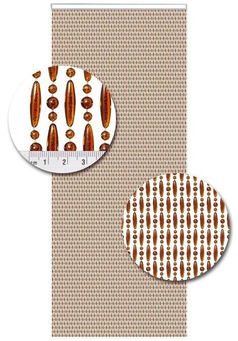 Dit zijn kwalitatief gezien echt goede kralengordijnen. De draadjes die gebruikt zijn, zijn gemaakt van nylon en dus extra sterk. De kunststof kralen zijn stuk voor stuk aan het nylon draad gesmolten. Het geheel hangt aan een witte cassette. Het is een vrij dicht kralengordijn waarbij er op circa elke centimeter een streng hangt. Om als voorbeeld even een vliegengordijn met een breedte van 90cm te noemen; hier hangen circa 90 strengen aan.