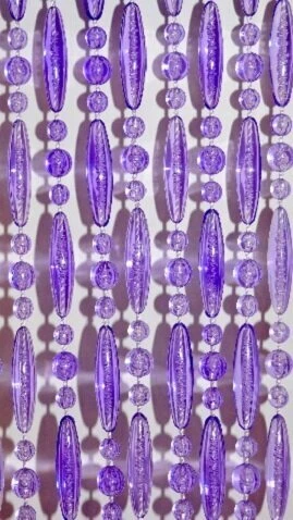 Luxe kralengordijn gemaakt van nylon draad. De kunststof kralen zijn stuk voor stuk aan het nylon draad gesmolten. Het geheel hangt aan een kunststof witte cassette.